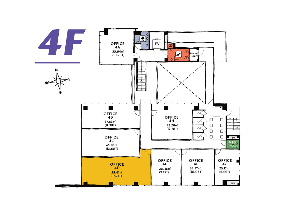 - 4F個別空調、ライティングレール、コンセント、ブラインド、共用インターネット、空配管